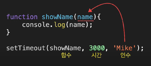 setTimeout(함수, 시간, 인수)