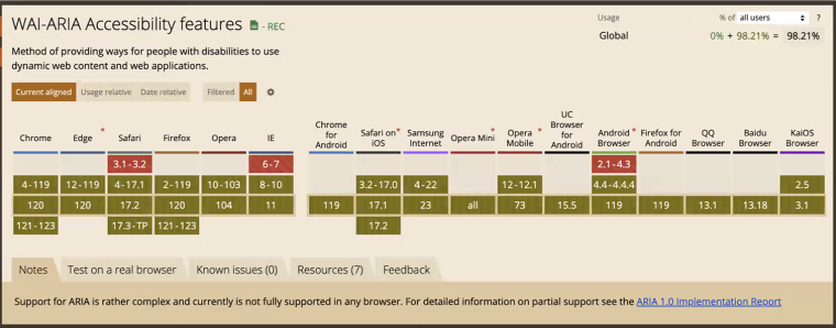 can i use 를 통해 확인하면 꽤 많은 브라우저들이 wai-aria를 지원한다는 것을 알 수 있다.