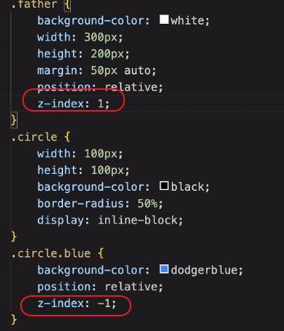 ㄴ 파란색 원에 transform: translate(0)을 주면 앞으로 나온다.