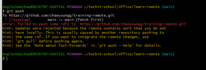 git remodte update : 업데이트 git push --set-upstream origin main ㄴ git push -u origin main git pull --set-upstream orgin(별칭) main(브랜치이름) : git을 이용해서 원격 브랜치에 있는 내용을 당겨다 pull >> 약자로는 git pull -u origin main