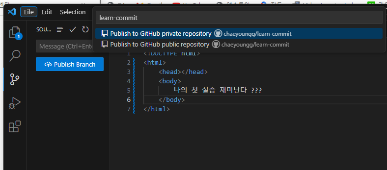 vscode 에서 바로 레파지토리 생성하기