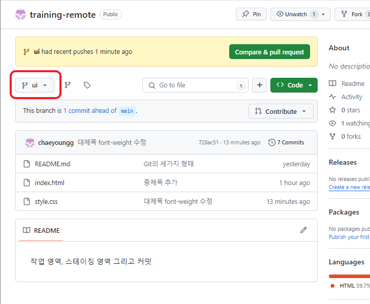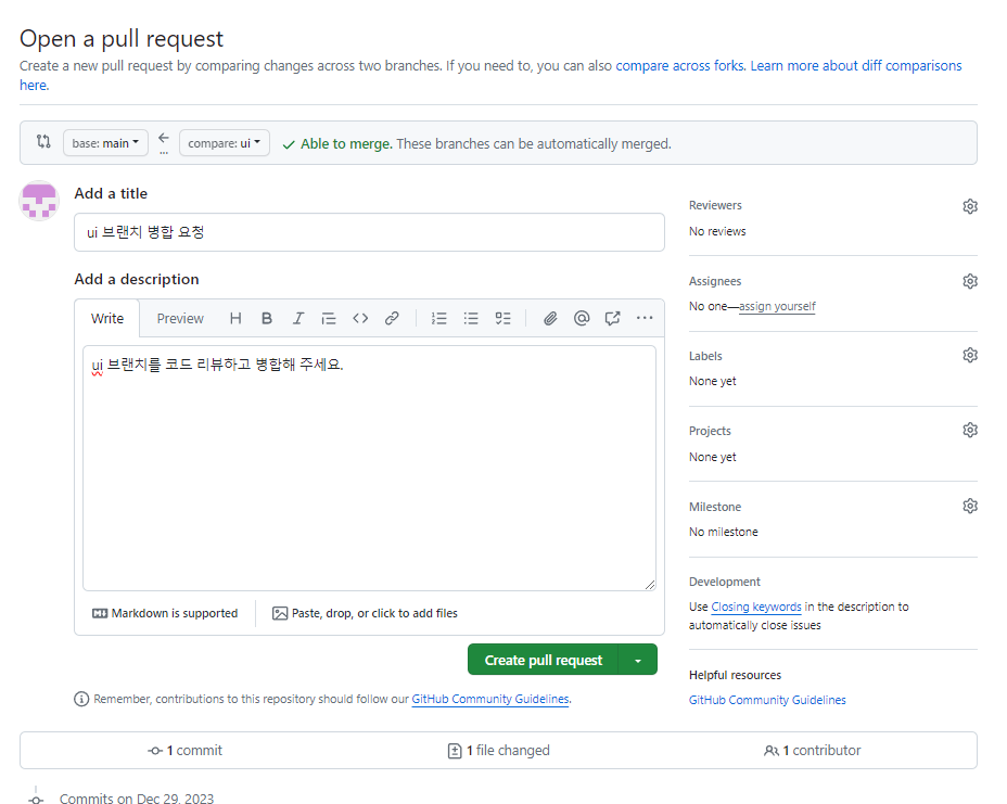 ui 브랜치의 작업을 볼 수 있다. 상단 초록색 박스를 누르면 병합도 할 수 있다.