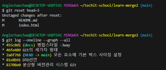 git reset --soft () : 같은 reset이지만 soft reset은 사라지지 않는다. ㄴ 커밋하기 이전인 staging 상태로 되돌려놓는다. > status로 확인가능 git reset --mixed () : ( default 값이기 때문에 git reset 해도 된다. ) ㄴ 커밋하기 이전인 working directory로 되돌려놓는다.