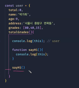 이 때 totalGrades의 this가 객체로 존재하므로, 이를 가져다 쓰게 되어 sayHi도 동일한 this 를 가르키게 된다!!!