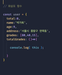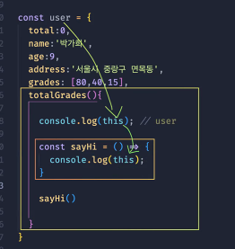 이 코드의 경우, user라는 객체의 화살표함수로 정의된 totalGrades가 있는데,