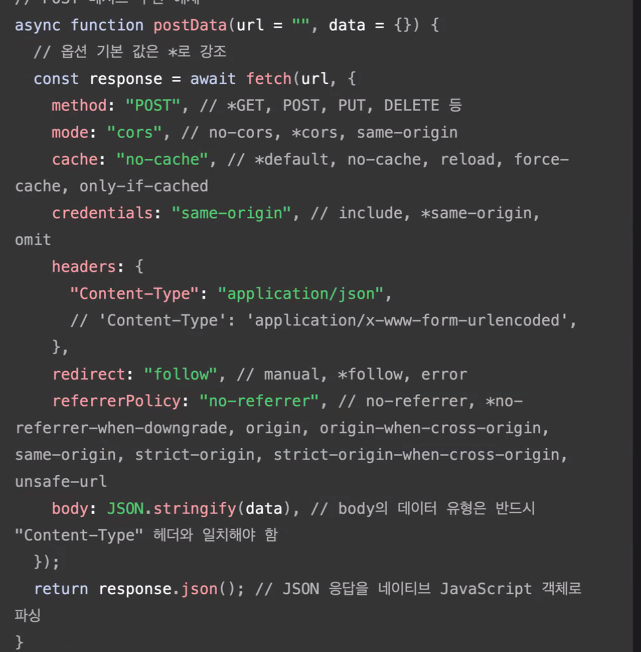 response.data = await response.json(); //데이터를 얻어올 때에는 json()으로 얻어온다.