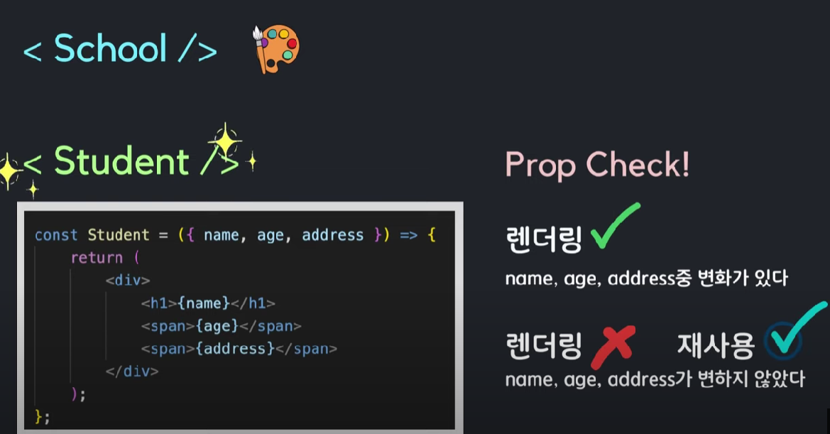 => 자식 컴포넌트가 렌더링이 될 상황에 놓일 때마다, 'prop-check'를 통해 최적화를 해주게 된다.