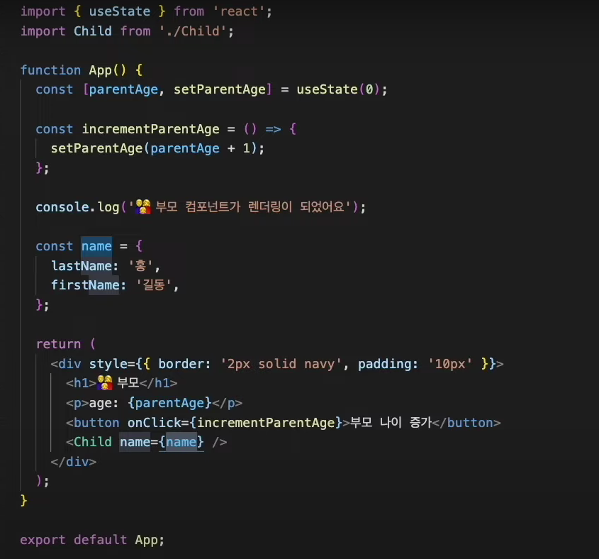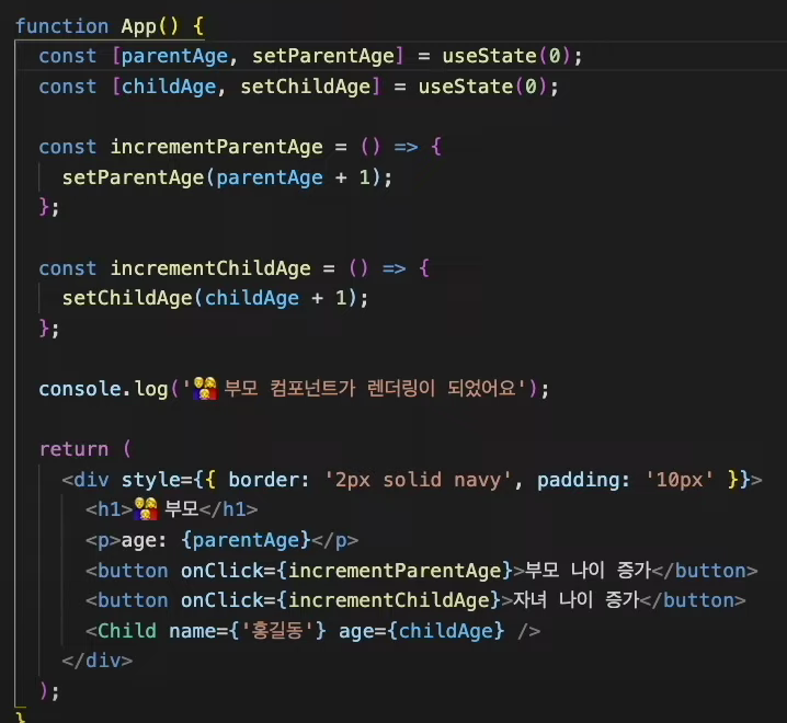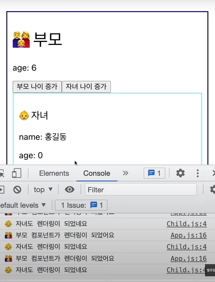 이 프로그램은 결국 App에 있는 부분을 렌더링하기 때문에, 부모의 나이값이 변화하면