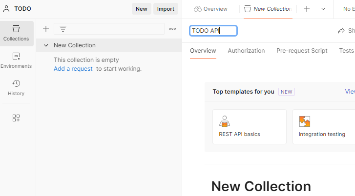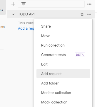 collection 생성 -> add request 생성 (http 리퀘스트를 생성한다.)