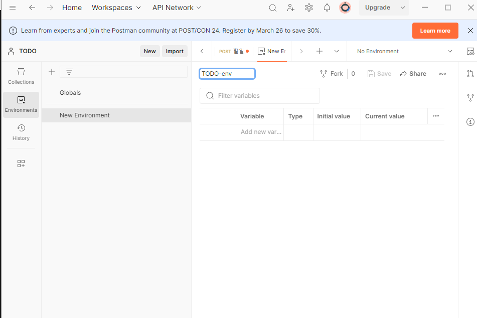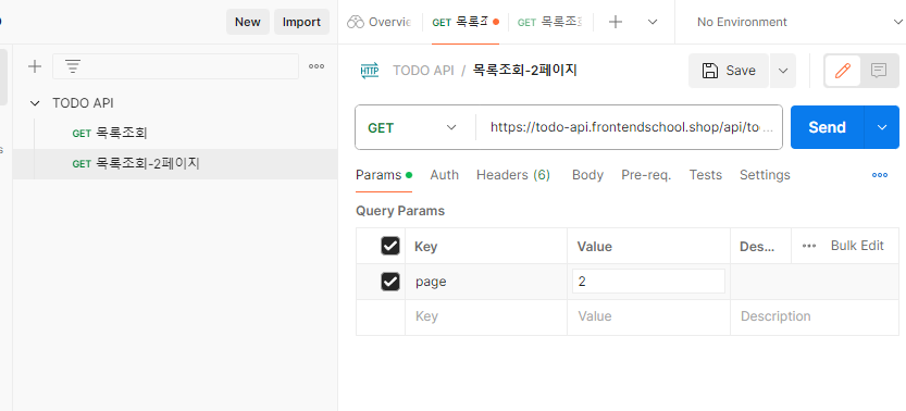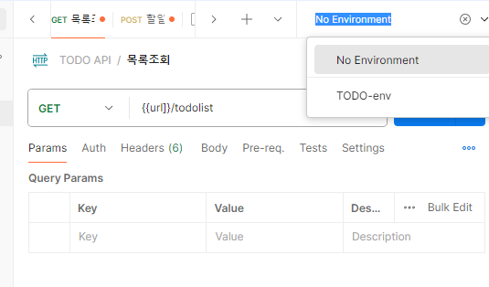 목록 조회에서 Environment 선택하고 {{url}}로 입력하면 환경변수 적용